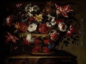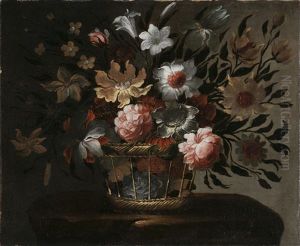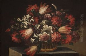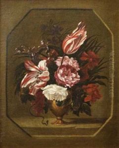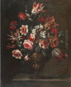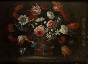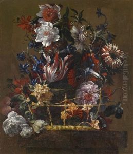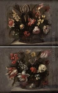 Lilies, Roses, Peonies, Pinks, Iris, A Tulip And Other Flowers On A Stone Ledge, An Earthenware Vessel Upper Left (+ A Tulip, Roses, Dahlias, Peonies, Campanula, Orange Blossom And Other Flowers On Some Steps, An Earthenware Pitcher Upper Right; Pair)