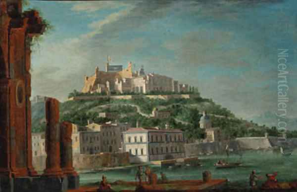 A view of a Sicilian harbour, with a citadel flying the flag of the two Sicilies