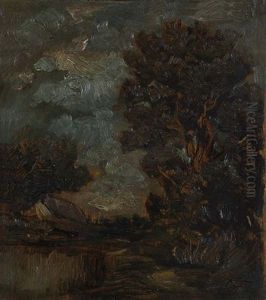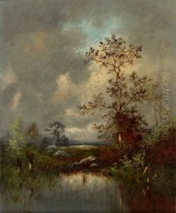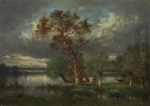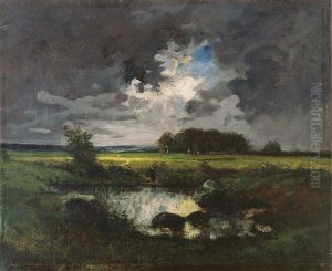 Gewitterstimmung Uber Einer Bewaldeten Ebene Mit Teich