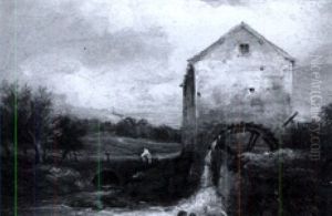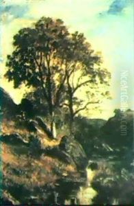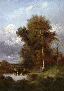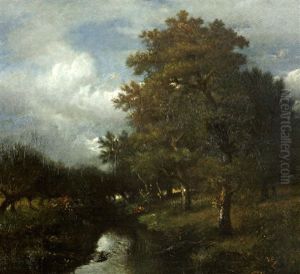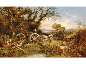 Blick In Waldlandschaft. Ein Bauer Fuhrt Sein Fuhrwerk Durch Einen Bach