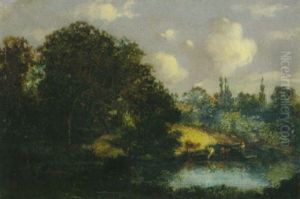Cattle Watering In A Wooded River Landscape