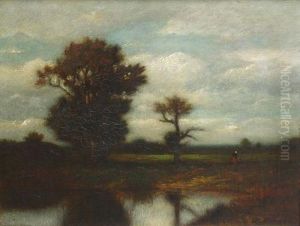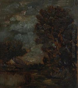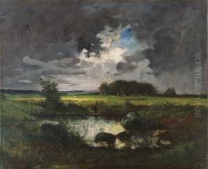 Gewitterstimmung Uber Einer Bewaldeten Ebene Mit Teich.