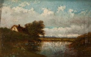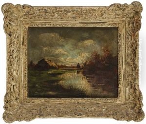 Abendliche Landschaft Mit Hutte Unter Kahlen Baumen Am Teichufer