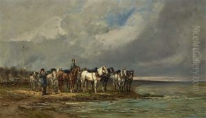 Chevaux S'abreuvant Aquarelle, Signee En Bas A Gauche. Haut. : 16 Cm - Larg. : 26 Cm