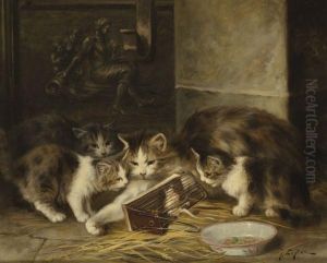 A Terrier And Kittens In An Elegant Interior Setting