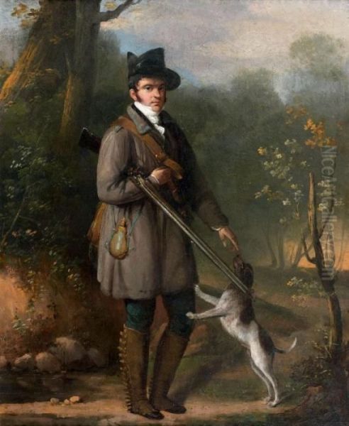 Portrait De Chasseur Avec Son Chien Dans Un Paysage