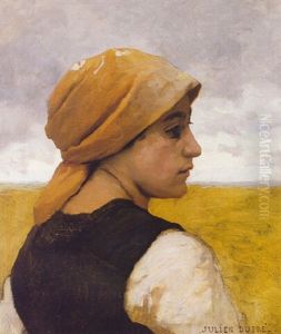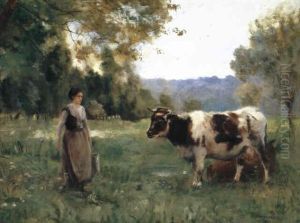 Wiesenlandschaft Mit Bauerin Und Kuhen