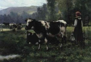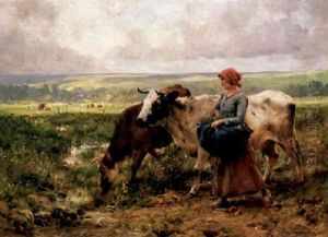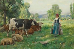 Bauerin Mit Kuhen In Einer Weidelandschaft