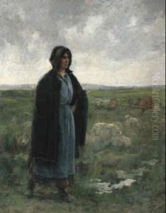 Stehende Hirtin Mit Schafen In Weiter Landschaft