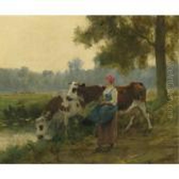 Young Maid With Her Cows At The Water's Edge