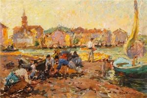 Kustenlandschaft Mit Booten, Pferdefuhrwerk Und Figurenstaffage