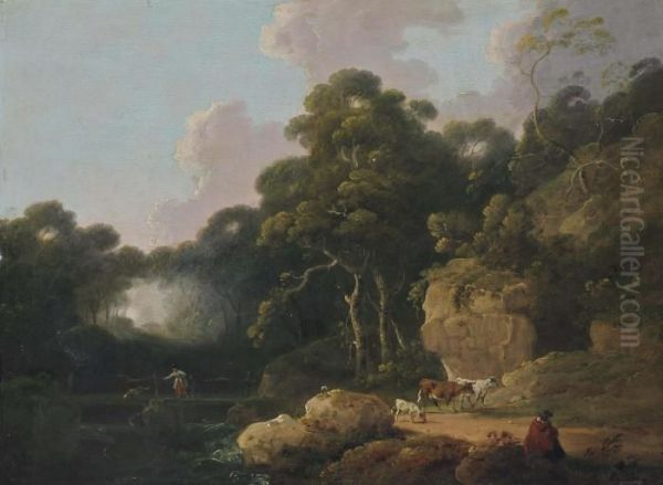 A Wooded River Landscape With A Drover And His Cattle