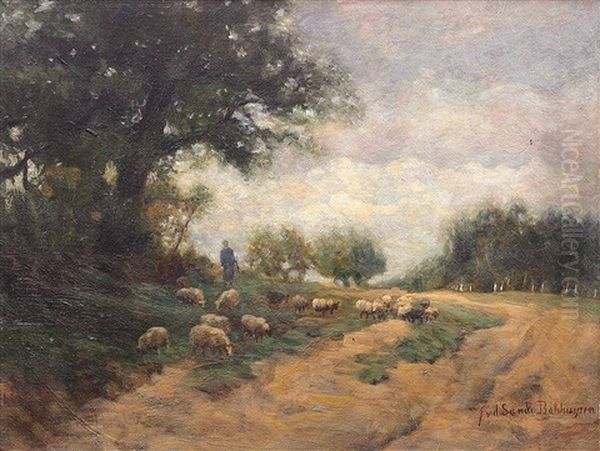 Schafer Und Herde Am Wegrand Im Schatten Einer Eiche