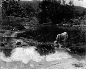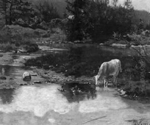 Landschaft Mit Kuh Am Bach