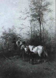 Pferdeweide Mit Einer Bauerin Und Ihrem Sohn, Die Zwei Rosse Zur Tranke Fuhren