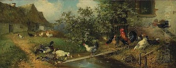 Chickens And Ducks By A Stream Oil Painting by Julius Scheuerer