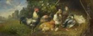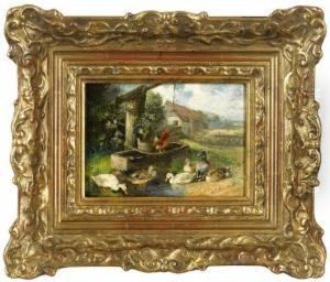 In The Park. Numerous Poultry And A Tortoise By An Old Well. Signed Right On The : Jul. Scheuerer