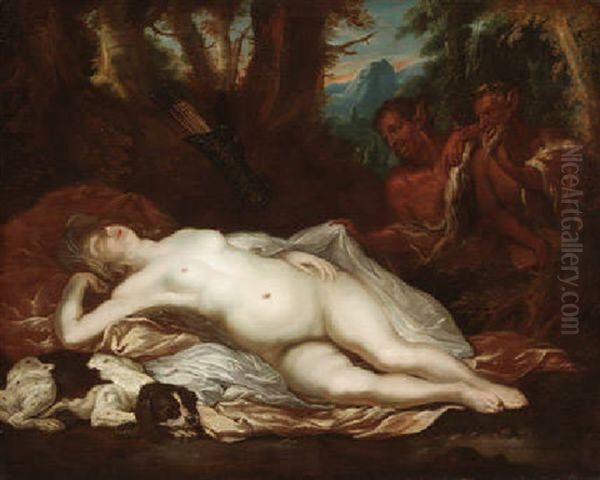 Zwei Sartyren Betrachten Die In Einer Waldlandschaft Schlafende Diana