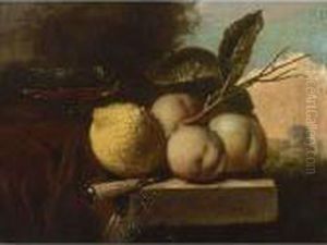 A Bowl Of Apples With A Stone Jug And Glass Of Wine On A Stone Ledge