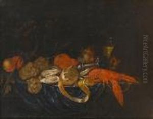 A Still Life With Peaches And A Lemon In A Wan-li Bowl, Oranges And Walnuts On A Silver Plate, Grapes, A Roemer, A Silver Can And A Knife, All On A Draped Table, Together With A Black Servant