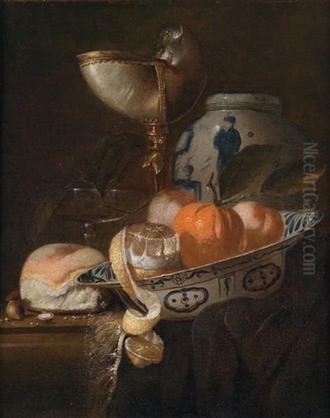 Stillleben Mit Nautiluspokal, Einer Chinesischen Vase Und Einer Wanli-schale Mit Einer Halbgeschalten Zitrone Und Anderen Zitrusfruchten
