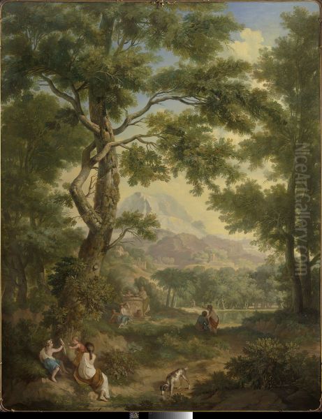 Arcadisch landschap met linksvoor kinderen met een vogel en een hond