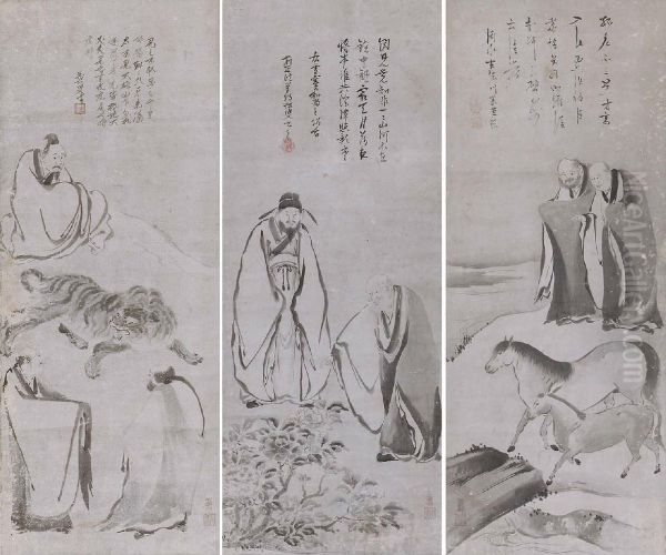 Horses And Zen Monks; Tiger And Lohans; Peony And Zen Monks