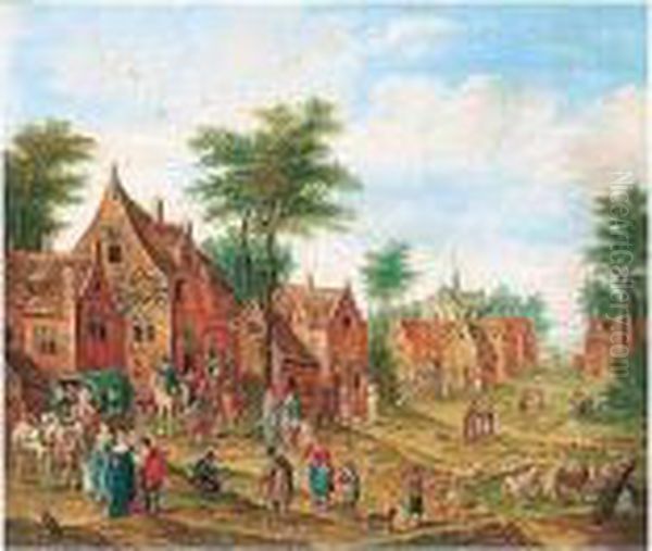 Village Scene With Numerous Figures And A Waggon