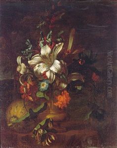 Still Life With Tulips, Irises, Narcissi, Honeysuckle, And Various Other Flowers In An Urn, On A Marble Pedestal
