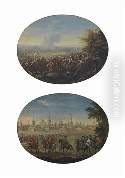 Cavalry And Infantry Outside Of A City; Cavalry And Infantry On The Battlefield (pair)