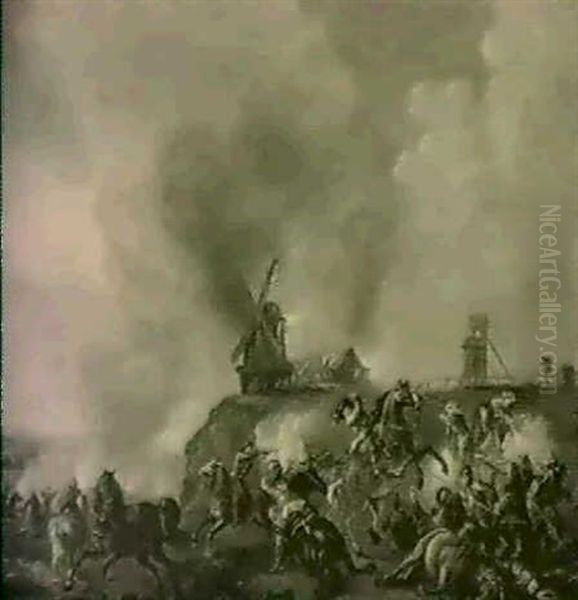 Reitergefecht In Einer Landschaft Mit Einer Windmuhle