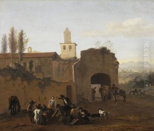 Herdsmen Resting In An Italianate Landscape, A Hilltop Town Beyond
