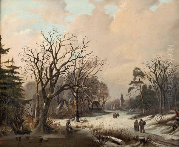 Winterlandschaft Mit Dorf Und Personenstaffage