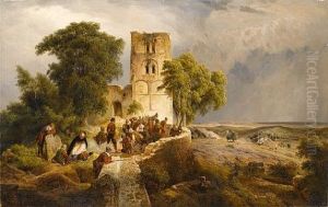 An Extensive Landscape With Soldiers By A Ruined Tower Awaiting An Attack