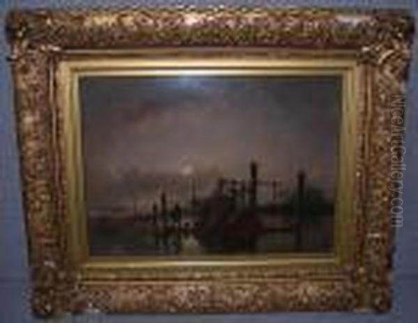 Description Attributed To Karl Heffner Figures Sorting Nets On A Pontoon By Moonlight