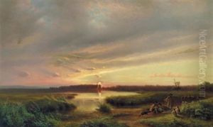 Abendlandschaft Mit Einem See Und Hirten