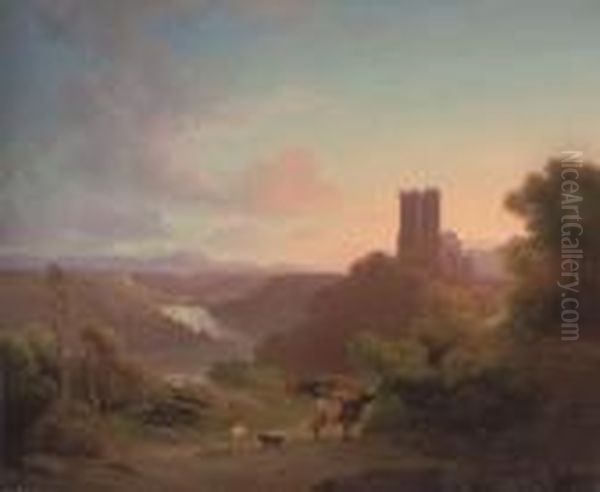 Cattle Before A Riverside Castle, Dusk