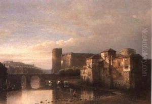A View Of A Riverside Town With Laundresses