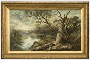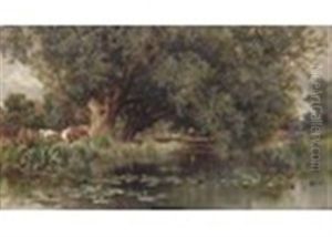 River Landscape With Woodland And Cattle By The Shore