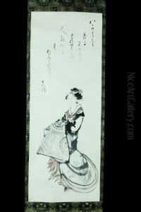Portrait En Pied De La Belle Okita De La Maison Naniwaya Marchant, Tenant Un Chadai