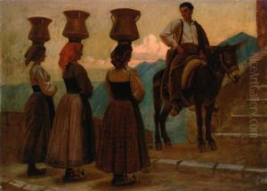 Pa Trappen. Italienske Piger Baerer Vand Op Af En Trappe I Byen Civita D'antino