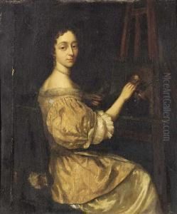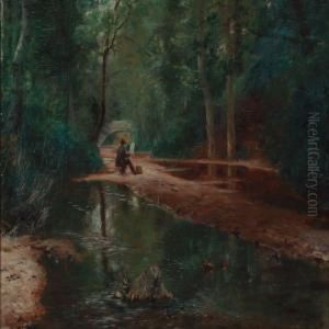 An Artist At Her Easel In A Wooded Landscape