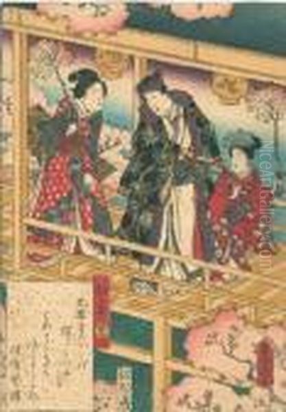 Genji Z Kobieta I Dziewczynka Niosacymi Galazki Kwitnacej Wisni