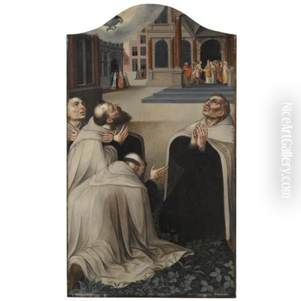 Bring the timeless beauty of Lambert Lombard's Four Carmelites Pray To The Virgin Mary Whose Symbol, The Rose Without Thorns, Appears In The Heavens, Whilst Her Marriage To Joseph Takes Place On The Steps Of The Temple Beyond into your home with a handmade oil painting reproduction. Carefully recreated on canvas by skilled artists using traditional techniques, this piece captures the delicate brushwork, subtle light, and vibrant color of the original masterpiece. With museum-level quality and rich texture, it brings elegance and artistic depth to any space. Enjoy free shipping and make this masterpiece a part of your personal collection.