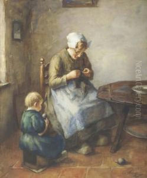 "at Eventide", Cottage Interior With A Dutch Girl Knitting Beside A Table, A Child Seated Nearby Signed, Inscribed With The Artist's Name On A Plaque Attached To The Frame, Also Inscribed On An Exhibition Label Verso With The Artist's Name And The
