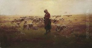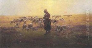 Strickendes Madchen Mit Ihrer Schafherde In Der Ungarischen Puszta