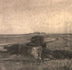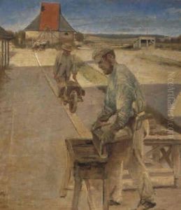 Arbejdere Ved Vandledningen Ved Sonderso. En Afstivet Udgravning Med Eng Og Skov Som Baggrund. To Maend I