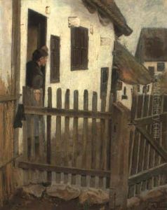 Bondekone I D+ren Til Et Hvidkalket Hus