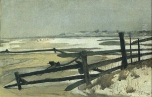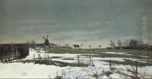 Klar Vinterdag Med Snedaekkede Marker Bag Gamle Huse, I Forgrunden Stakit