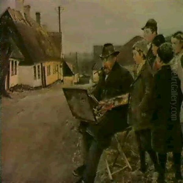 En Maler I Landbyen. Han Sidder Til Hojre Pa Gaden Med Blod Hat Og Briller, Aben Malerkasse Pa Skodet Og En Farverig...